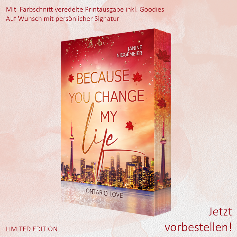 Diese tollen Farbschnittausgaben der Bände der »Ontario Love«-Reihe könnt ihr exklusiv in einer kleinen Buchbox mit zahlreichen Goodies und persönlicher Signatur nach Wunsch für 17,90 Euro plus 2,75 Euro Versand über mich beziehen.